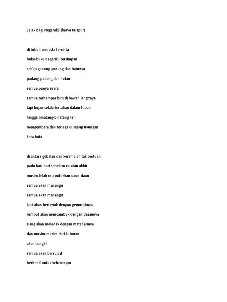 Sedangkan untuk pelajar sltp, diwajibkan membacakan salah satu puisi dari 4 karya puisi yang disiapkan panitia, yakni sajak buat negaraku (kriapur), doa seorang serdadu sebelum berperang (ws rendra), nyanyian tanah air (saini km) atau sajak buat musuh yang merupakan puisi terjemahan penyair leon agusta. Ratu rimba niagara 2 zulkaedah 1435h 28 ogos 2014 Aku kan membelamu sepanjang masa. Semua terhampar biru di bawah langitnya. Sajak buat negaraku karya :