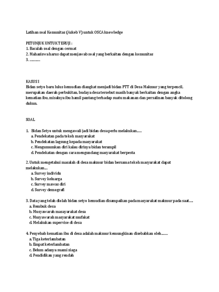 Pengertian bidan komunitas adalah a. (1) konsep dasar nifas, (2) kebutuhan dasar pada… Latihan soal nifas fisiologis untuk uji sib str kasus i ny deni umur 25 tahun mengatakan 6 jam yang lalu melahirkan anak pertama secara normal dengan berat 3000 gram saat ini mengeluh lelah perut mules dan belum bak dan masih pasif. Contoh soal sosiologi kelas 12 semester 1 beserta. Memahami perbedaan buku kas umum bos k3. Home soal latihan soal latihan uts semester 3 askeb nifas. 6 minggu post partum e. Contoh soal skenario untuk uji kompetensi bidan (2) asuhan kebidanan ibu nifas dan menyusui (2) 1. Askeb nifas & menyusui disusun oleh : Ny deni , umur 25 tahun , mengatakan 6 jam yang lalu melahirkan anak pertama secara normal dengan berat 3000 gram, ,saat ini mengeluh lelah , perut mules dan belum bak dan masih pasif. Blog tentang dunia kesehatan dan kebidanan, materi kuliah div kebidanan, diii kebidanan, dan organisasi 6/04/2012 latihan soal nifas fisiologi untuk osca knowledge part 1 Suatu keadaan setelah plasenta lahir sampai kembalinya alat kandungan seperti semula disebut …. Latihan soal pilihan ganda materi asuhan kebidanan ii persalinan beserta jawaban.